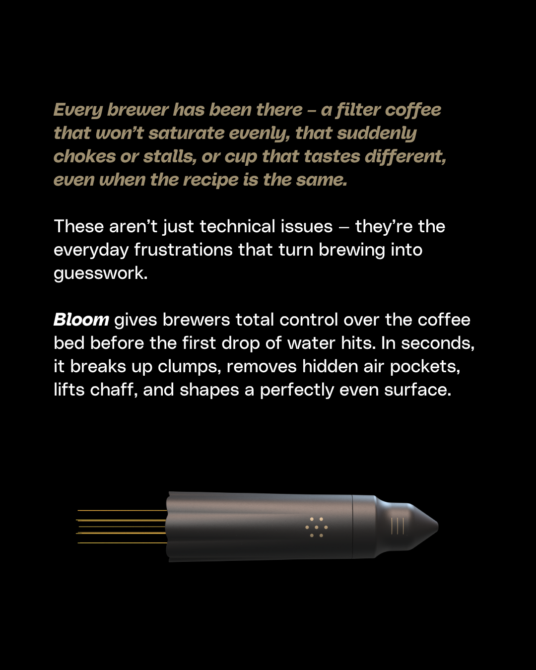 The Nucleus Bloom is a professional-grade tool designed to eliminate variables in filter coffee brewing. It focuses on optimizing the structure of the ground coffee bed to ensure maximum extraction uniformity.
